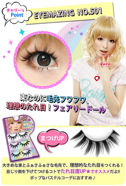 Like her first single “Ponponpon” (and, indeed, her entire Moshi Moshi Harajuku EP), it was written and produced by Yasutaka Nakata of capsule and Perfume fame. It comes from her full-length debut album, which will be released next week. “Tsukematsukeru” is about false eyelashes, and is apparently tied to a line of KPP-branded lashes; see below: