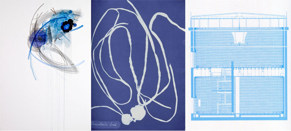 At times, her abstract forms are organic, and may resemble a flower bud or a leaf. In a way, the images are reminiscent of cyanotypes, not only because of the strong use of blue but also because of cyanotypes’ early history as a way to depict organic specimens. For a counterexample, look at the images of Anna Atkins. Atkins’ technique makes details lessen, so the image is an outline of the flora. This is not the case with Estrada, however, whose forms are not necessarily flowers or leaves—in fact, they are complex abstract shapes with intricate detail. In an interview with Stephanie Buhmann for The Villager, Estrada explained that the blue of these works is a nod to architectural blueprints.