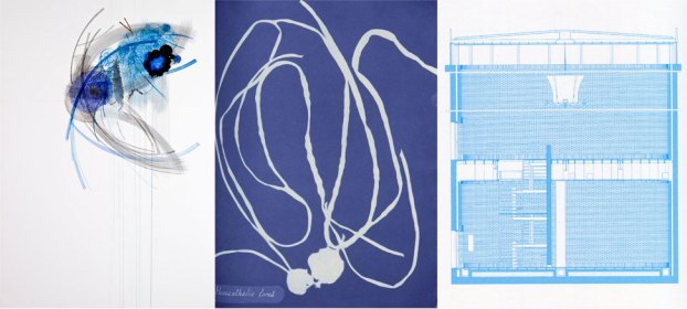 “I always wanted to work with architectural blueprints, as I love their powdery, purplish blue lines,” she said. “In some ways these works reflect my affinity for these documents.”