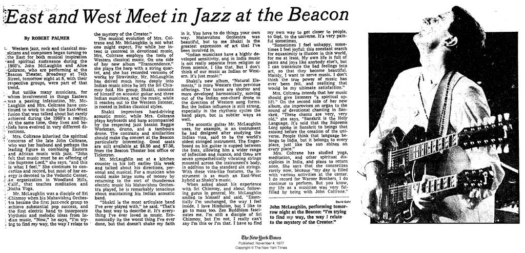 And when she wasn’t criticized, she was simply ignored. I searched the New York Times archive — which I had found to be an incredibly valuable resource for writing about Cecil Taylor when researching In the Brewing Luminous — and found not one album or concert review from the period when Coltrane was most active. You might think the paper would have sent John S. Wilson, their jazz critic at the time, to the 1972 Carnegie Hall concert mentioned above, but nope. It wasn’t until 1977, when she was largely retired from music, that Robert Palmer interviewed her and guitarist John McLaughlin in advance of a co-headlining concert at the Beacon Theatre.